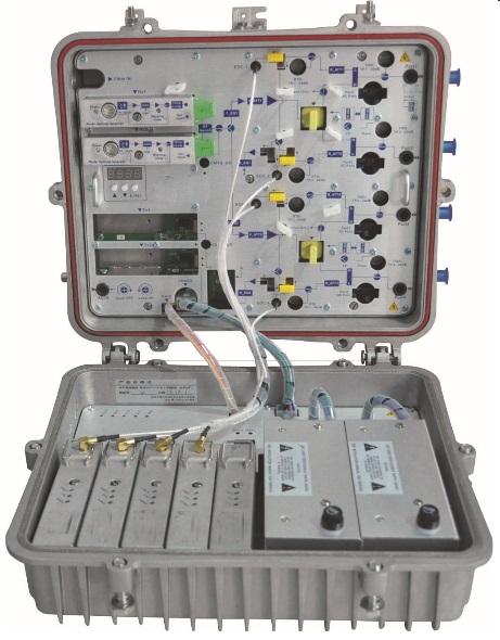 OPR-8414SJL-E is the three-in-one outdoor optical node that integrated optical receiver, ONU and EoC. It can be configured 2 forward path optical receiver modules, 1 switching control motherboard, 1 EPON ONU module, 4 EoC modulation modules (CLT) and 2 switching power supply modules at most. RF part adopts advanced optical AGC technology, the output level and output slope both adopt the electric control circuit. Support LED nixie tube display function, can output 4-way RF signal.