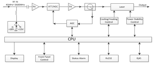 (1) OPT-2600DB-U series Optical Transmitter adopts high-linearity butterfly DFB laser which is directly modulated to transmit 47-862MHz and 960~2600MHz signal in a single fiber.
