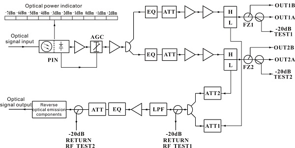 (6) Optical AGC control, when input optical power is -7~+2dBm, the output level, CTB, CSO basically unchanged.