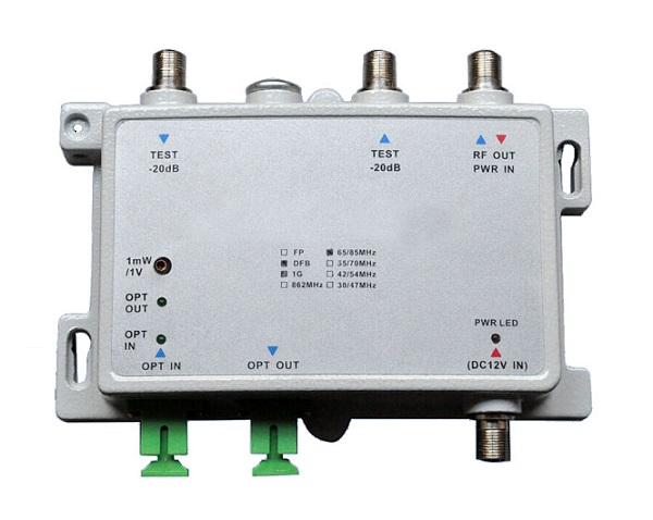 1. Forward optical receive part: with 10km standard optical fiber, passive optical attenuator and standard optical transmitter composed the testing link. Set 59 PAL-D analog TV channel signal at range of 47/85MHz ~550MHz under the specified link loss. Transmit digital modulation signal at range of 550MHz ~862/1003MHz, the digital modulation signal level (in 8 MHz bandwidth) is 10dB lower than analog signal carrier level. When the input optical power of optical receiver is -1dBm, the RF output level is 92dBμV, measure the C/CTB, C/CSO and C/N.