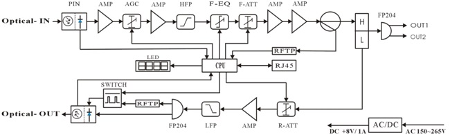 1) Excellent optical AGC control technique, when the input optical power range is -9~+2dBm, the output level, CTB and CSO basically unchanged;