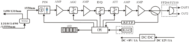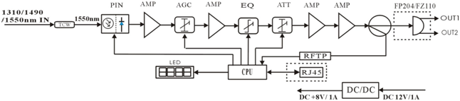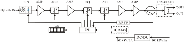 1) Adopt advanced optical AGC control technique, the maximum AGC control range (adjustable) is -9~+2dBm;
