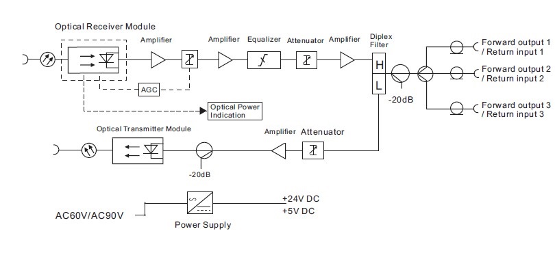 3) Optic AGC function to keep stable output level (110dBuV) within the optic receiving -8~+3dBm