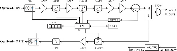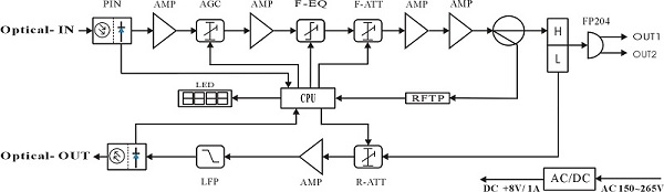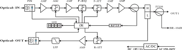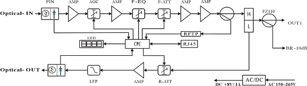 1) Adopt advanced optical AGC technique, optical AGC control range: +2dBm ~ -9/-8/-7/-6/-5/-4dBm adjustable;