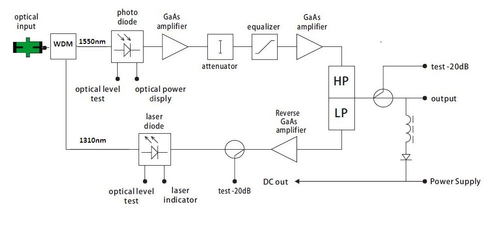 Features (1) Excellent linearity, flatness and low return loss (2) Compact construction, low power consumption (3) WDM to achieve single fiber bi-directional transmission. Dual fiber bi-directional available (OPR-1285D) (4) Single out (75Ω Impedance ) (5) Amplifying circuit adopts GaAS material