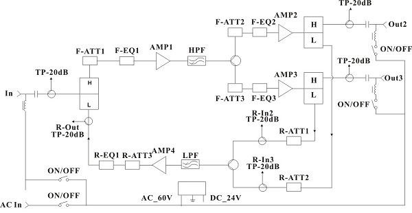 (1) Forward path use import low noise push pull amplify module or GaAs push pull module,2 Power-Double module or GaAs amplify module are used as output stage, Output level is stable and nonlinear index is good, import high index amplify module are used on return path, It's distortion is little and SNR is high.