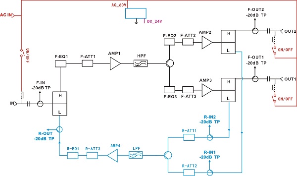 (1) The forward path preceding stage adopts the newest high index imported low noise push-pull amplifier module or GaAs push-pull module, output stage adopts the newest high index imported power doubly amplifier module or GaAs amplifier module. The nonlinear index is good and output level is more stable. The return path adopts the newest high index imported return dedicated amplifier module. The distortion is low and the signal to noise ratio is high.